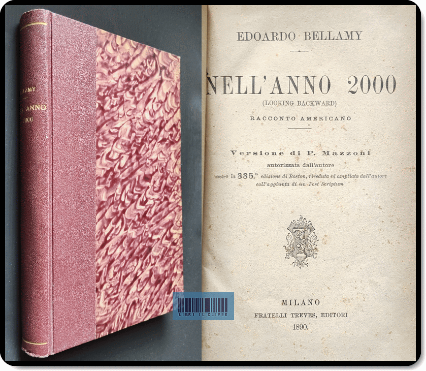 BELLAMY. NELL'ANNO 2000 (LOOKING BACKWARD). TREVES, 1890. 1A EDIZIONEEdoardo Bellamy. NELL'ANNO 2000 (LOOKING BACKWARD). Racconto americano. Versione di P. Mazzoni. Milano, Treves, I edizione originale italiana, 1890. vii-308 p., 12x18,5 cm. Legatura coeva mz. pelle amaranto e cartone marmorizzato con titoli in oro al dorso. Buono stato; bruniture ai margini delle carte, qualche lieve mancanza e sporcatura. # Pubblicato negli Stati Uniti nel 1888, Looking Backward: 2000-1887 è il celebre romanzo utopico di Edward Bellamy, insuperato bestseller dell'epoca, portato in Italia nel 1890 col titolo Nell'anno 2000. Il libro immagina che Julian West, addormentatosi nella Boston del 1887, si risvegli appunto nell'anno 2000, in una società radicalmente trasformata, nella quale l'autore delinea un ordine sociale cooperativo, razionalizzato e orientato al bene comune, in alternativa alle disuguaglianze del capitalismo ottocentesco. Più che un semplice romanzo fantastico, è una critica delle tensioni sociali e industriali del suo tempo, tradotta nella forma seducente della visione futura. Per questo, Looking Backward (definito da Eric Fromm "uno dei libri più notevoli mai pubblicati in America") resta uno dei testi più influenti della letteratura utopica moderna, a metà tra romanzo politico, anticipazione sociale e protofantascienza. # RARA PRIMA EDIZIONE ITALIANA. EUR 80,00 » Prenota |