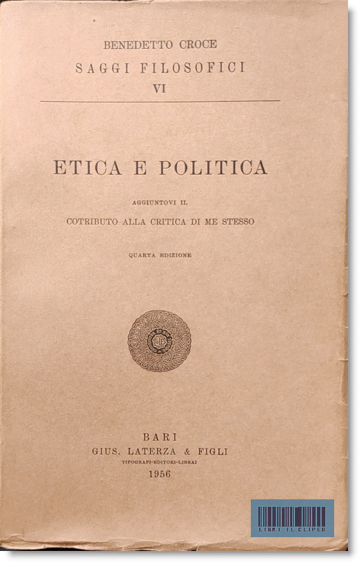 CROCE. ETICA E POLITICA. AGGIUNTOVI IL "CONTRIBUTO ALLA CRITICA DI ME STESSO". LATERZA, 1956Benedetto Croce. ETICA E POLITICA. AGGIUNTOVI IL "CONTRIBUTO ALLA CRITICA DI ME STESSO". Quarta edizione. Bari, Laterza, novembre 1956. 462 p., 14x22 cm. Br. ed. a colori. Buono stato; bruniture. # Comprende i "Frammenti di etica" e gli "Elementi di politica" (pubblicati sin dal 1915 su riviste e periodici), nonché l'importante "Contributo alla critica di me stesso" (1918). EUR 25,00 » Prenota |