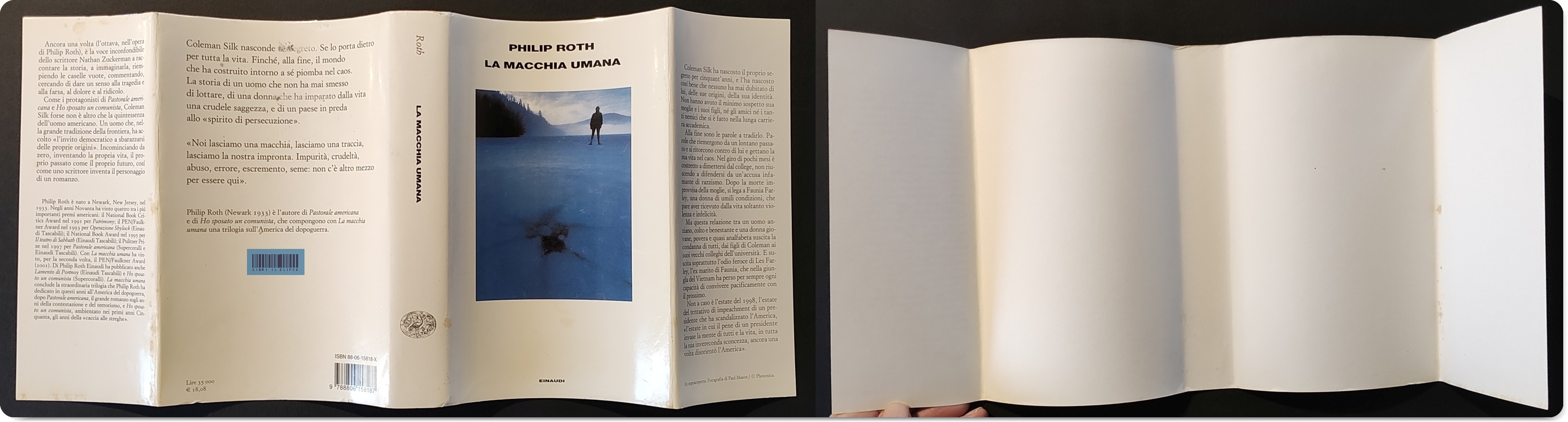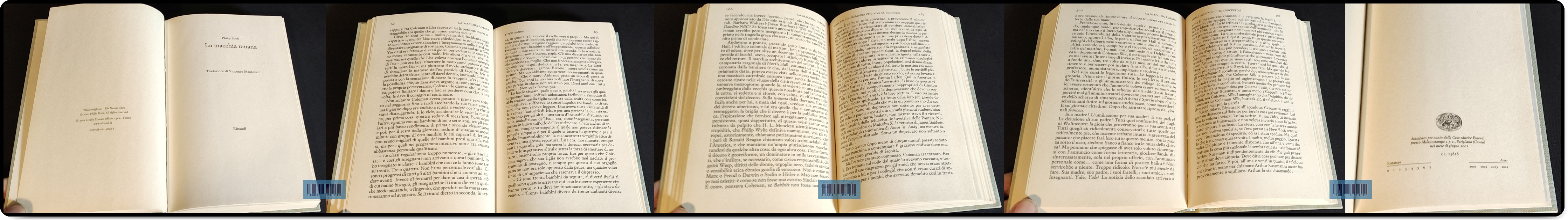 ROTH. LA MACCHIA UMANA. EINAUDI, 2001. 1A EDIZIONEPhilip Roth. LA MACCHIA UMANA. Traduzione di Vincenzo Mantovani. Titolo originale: The Human Stain. Torino, Einaudi, «Supercoralli», I edizione originale italiana, giugno 2001. ISBN 880615818X. FUORI CATALOGO. 392 p., 14,5x22,5 cm. Legatura ed. t. tela con sovracc. ill. a colori di Paul Mason. Ottimo stato. # DOPO LAMENTO DI PORTNOY E PASTORALE AMERICANA, UN ALTRO CAPOLAVORO DI PHILIP ROTH. PEN/FAULKNER AWARD 2001. # RARA PRIMA EDIZIONE ITALIANA. # Altre immagini QUI, QUI e QUI EUR 50,00 » Prenota |