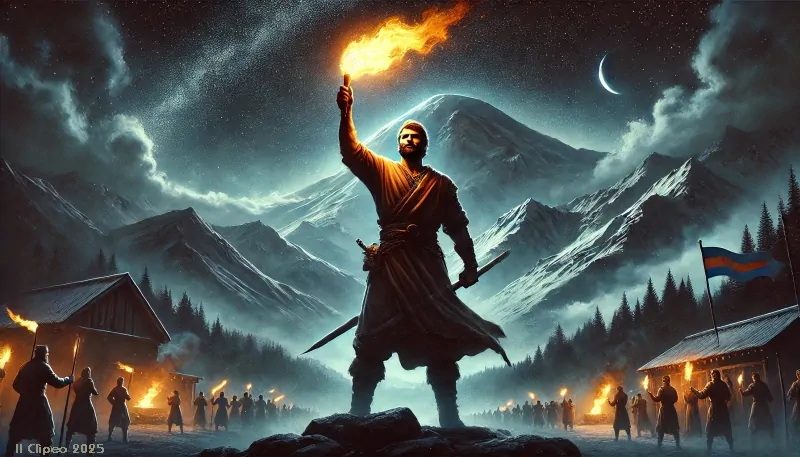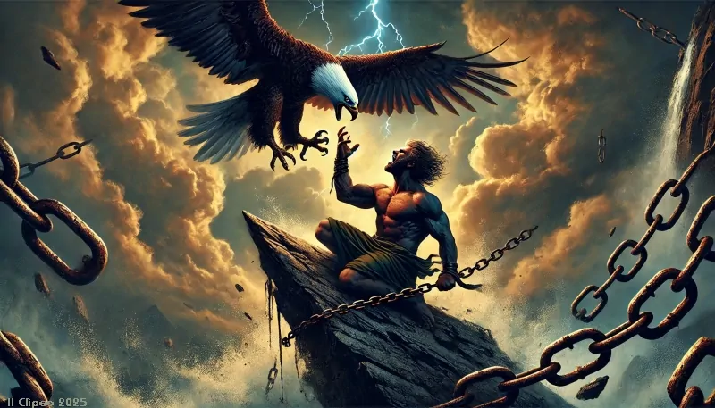 Gli dèi, furiosi per la ribellione di Amirani, forgiarono catene d'acciaio incantato e lo legarono alla montagna più alta. Lì, un'aquila, figlia del cielo e del vento, discese ogni giorno per divorare il suo cuore. Ma la notte, il cuore di Amirani si rigenerava, e con esso la sua ira contro gli dèi. Si dice che le sue grida risuonino ancora tra le vette, ricordando all'uomo che la libertà non si concede senza sofferenza.