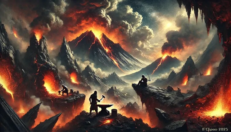Amirani rubò il fuoco dai cieli e lo nascose in una pietra. Con la sua spada di ferro colpì la pietra e il fuoco divampò. 'Questo è per gli uomini', disse, 'perché possano dominare le tenebre e forgiare il loro destino'. Gli dèi lo videro, e giurarono vendetta, ma Amirani non tremò.