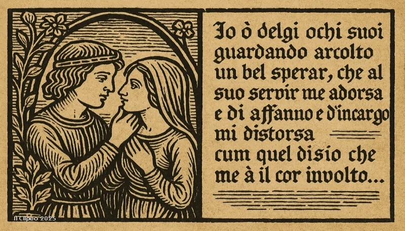 Nella seconda quartina, lo sguardo rivolto agli occhi della donna genera un "bel sperar":