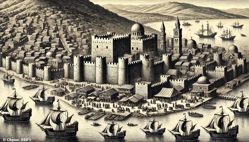 Con straordinaria rapidità, la circondano di mura, e sul ripido colle che sovrasta la rada si elevano già le prime torri della fortezza, segno tangibile della loro volontà di dominio.