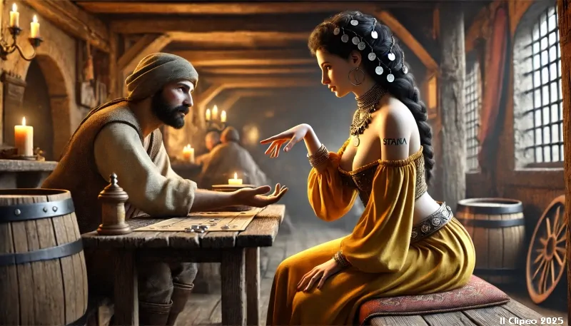 Con dita esperte, sta leggendo la mano di Azzolino, che, tra il serio e il divertito, si lascia scrutare il destino. Un sorriso ironico gli incurva le labbra mentre, con i lunghi baffi irsuti, solletica la guancia della donna, sussurrandole parole che la fanno ridere piano.