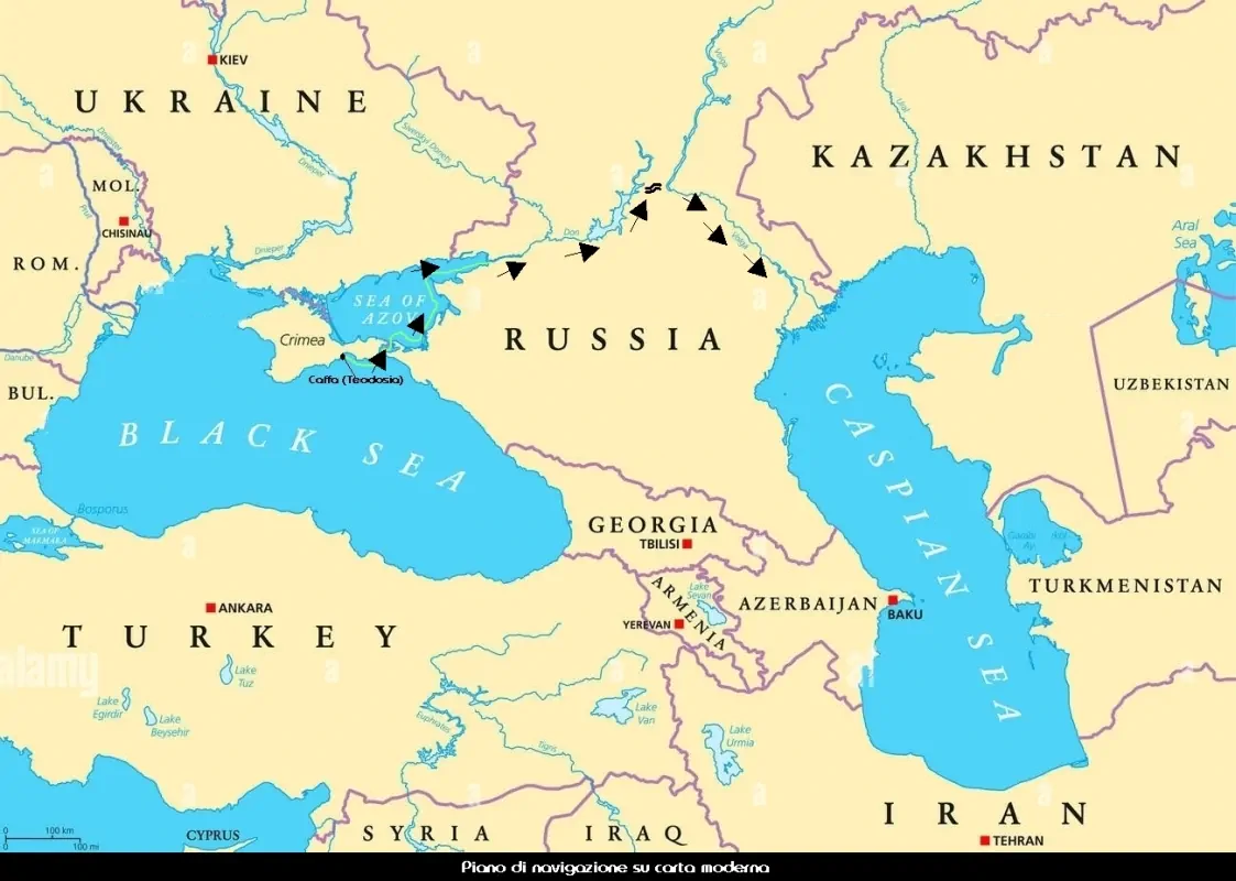 Ma è l'esecuzione del piano, non già solo la sua audacia, ad avere dell'incredibile. Prevede, infatti, che partendo dal Mar Nero, e traversando poi il Mare d'Azov, le fuste (veloci e leggere navi a remi monoalbero, lunghe una ventina di metri) risalgano il fiume Tanai (Don) fino al punto in cui questo è più prossimo al Volga, separandoli solo un istmo di una sessantina di miglia. Quivi, le imbarcazioni andranno tratte in secco e, adagiatone lo scafo su apposite ruote e rulli, trascinate attraverso la steppa, a mo' di anfibi carrocci, col loro carico di attrezzi, di viveri e di armi. Raggiunto il corso del Volga, le si rimetterà in acqua per percorrerlo giù giù fino al Mar Caspio, corseggiando le coste ricche dell'«Orda d'Oro» e sfidando a sorpresa il Kan di Kigiak nel cuore del suo stesso regno.