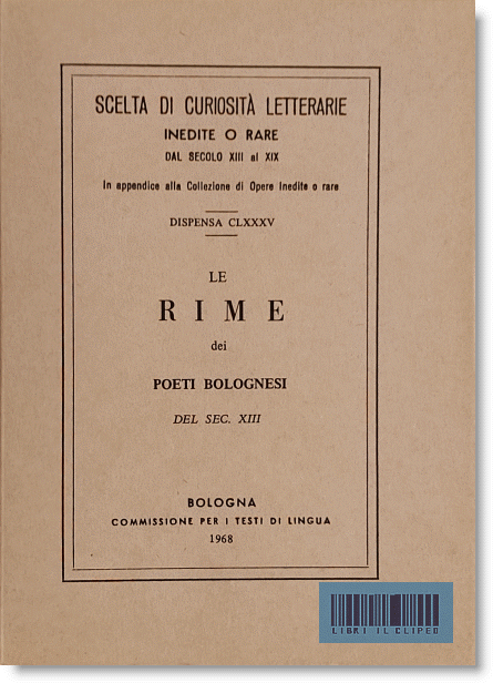 AA.VV.. LE RIME DEI POETI BOLOGNESI DEL SECOLO XIII. FORNI, 1968. NUOVOLE RIME DEI POETI BOLOGNESI DEL SECOLO XIII. Raccolte ed ordinate da Tommaso Casini. Bologna, Commissione per i testi di lingua, «Scelta di curiosità letterarie inedite o rare dal secolo XIII al XIX» (CLXXXV), Forni, ottobre 1968. Ristampa anastatica dell'edizione di Bologna, Gaetano Romagnoli, 1881. lxi-432 p., 12,5x17,5 cm. Br. ed. in nero. Esemplare nuovo. # Poesie degli antichi rimatori bolognesi del Dugento primamente raccolte in un sol corpo ed ordinate con cure nuove. EUR 80,00 » Prenota |