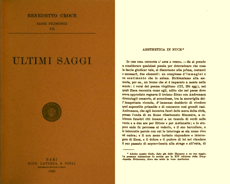 omposto nel 1928 su espressa richiesta della Enciclopedia Britannica, tradotto in inglese da Robin G. Collingwood, filosofo e amico di Croce, e pubblicato nel 1929 appunto nella 14ª edizione dell'Enciclopedia più prestigiosa al mondo, Aesthetica in nuce è il saggio dell'età matura, l'epitome crociana, l'Estetica in summa del più autorevole pensatore italiano del Novecento.