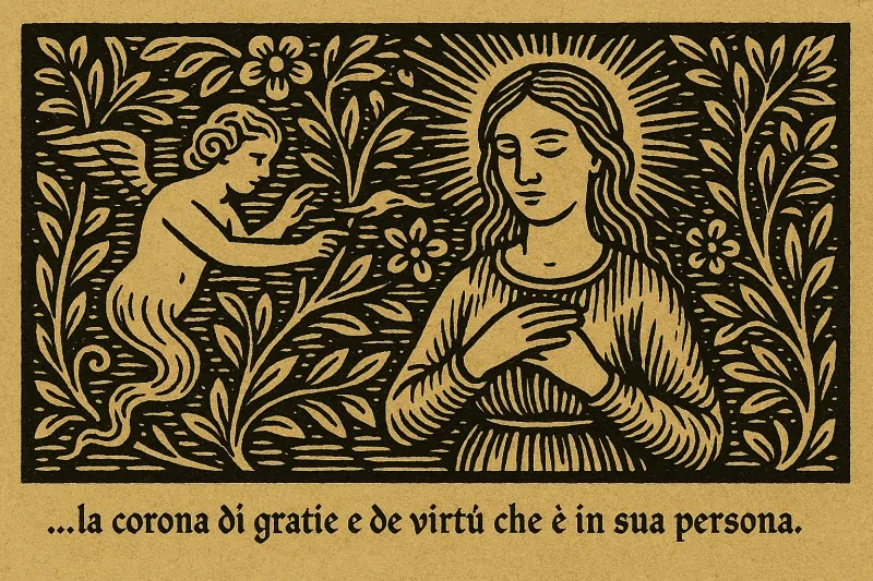"la corona di gratie e de virtú": simbolo delle virtù interiori rese visibili; metafora morale e mistica, ma qui concentrata in una visione luminosa e personale.