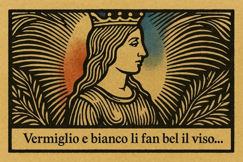 "vermiglio e bianco ... verde": corrispondenza cromatica alle tre virtù teologali, come in Dante (Purgatorio XXIX–XXX): rosso per la carità, bianco per la fede, verde per la speranza.