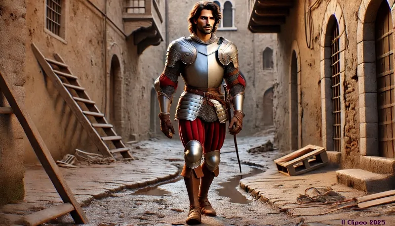 Rientrato nella sua modesta dimora, si chiude nella stanza. Le pareti sono coperte di armi, trofei raccolti nel corso di mille battaglie: corazze fiorentine e milanesi, cotte di maglia, morioni, scudi, balestre, scimitarre, giavellotti.