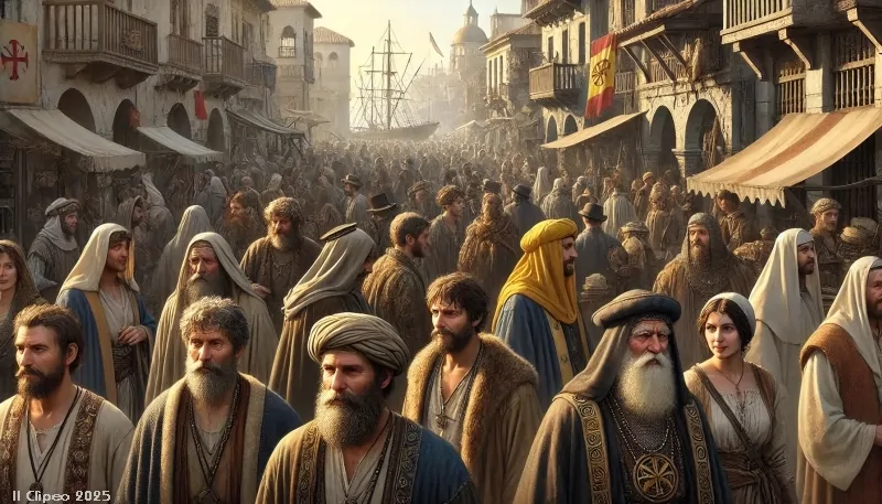 Nocchieri genovesi, col volto bruciato dal sole e le barbe incolte che li assomigliano a corsari algerini, si muovono tra la folla con l'aria sbrigativa di chi conosce il mare meglio della terraferma. Preti latini, dal volto imberbe e severo, si incrociano con papassi bizantini, irsuti e solenni nelle loro lunghe vesti. Mercanti armeni, coperti di tuniche ornate di pelliccia, contrattano con voci basse e gesti misurati. Russi e persiani, con i loro alti colbacchi di pelo, si mescolano ai banchieri ebrei, ravvisabili per la berretta gialla che ne segna la condizione. Greci ricciuti, chiassosi e striscianti, si fanno largo con sorrisi ambigui e occhi vigili, mentre ricchi borghesi di Caffa, avvolti nei loro mantelli pesanti, si muovono con la sicurezza di chi governa il commercio della città.