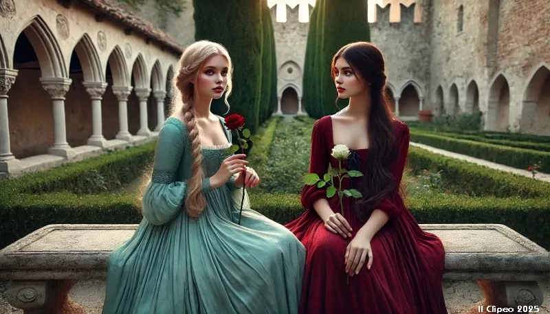 Entrambe si siedono su un banco di pietra, all'ombra dei giardini della villa, e cominciano a sfogliare i petali, raccogliendoli con cura in un lino bianco. Mentre le dita scorrono leggere tra le corolle profumate, il discorso prosegue con leggerezza, fino a toccare un nome che fa sobbalzare il cuore di un uomo nascosto tra le ombre.